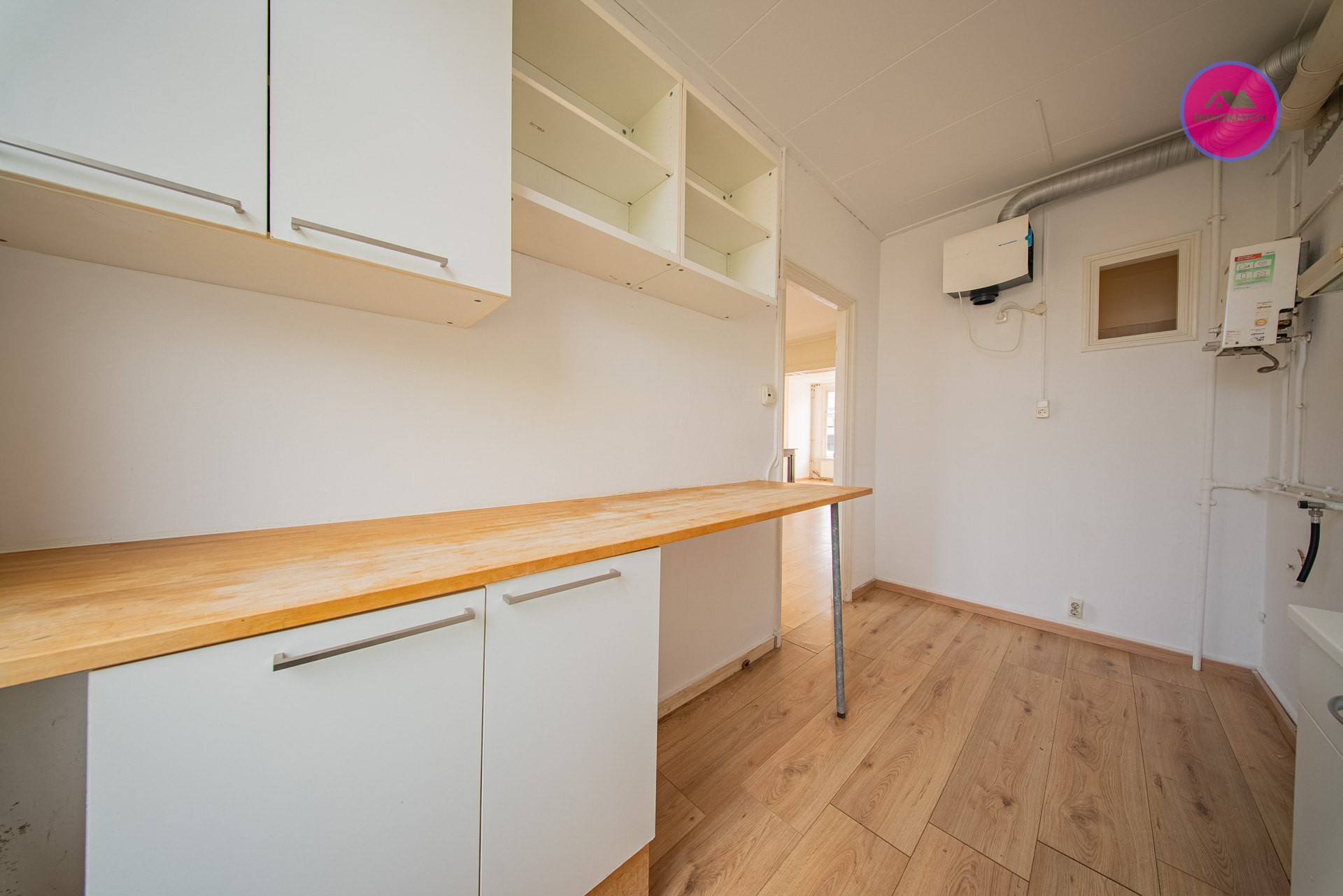 Aan de achterzijde vind je de ruime eetkamer met openslaande deuren naar het riante dakterras van ca. 12,5 m² . De keuken ligt eveneens aan de achterzijde.