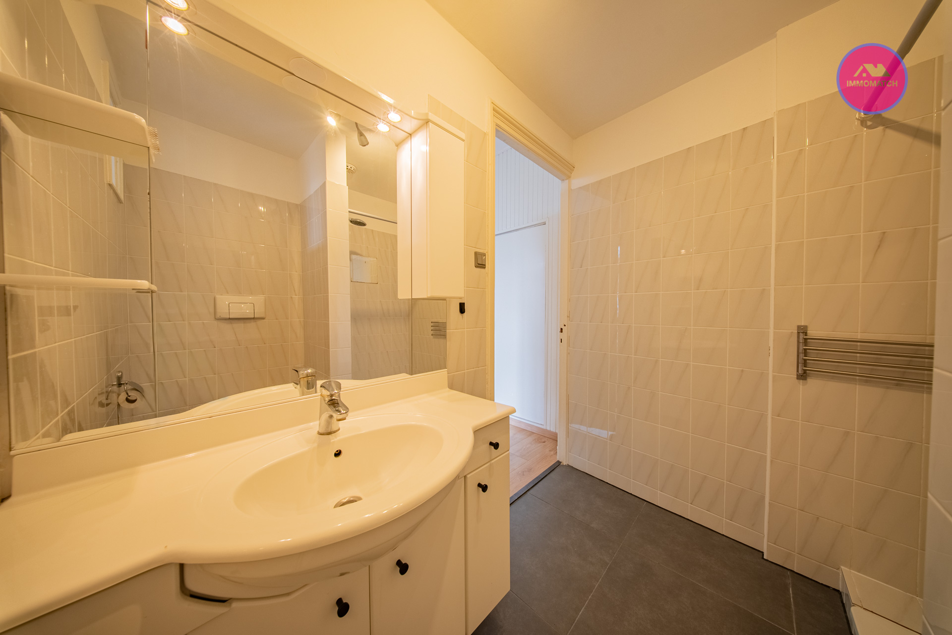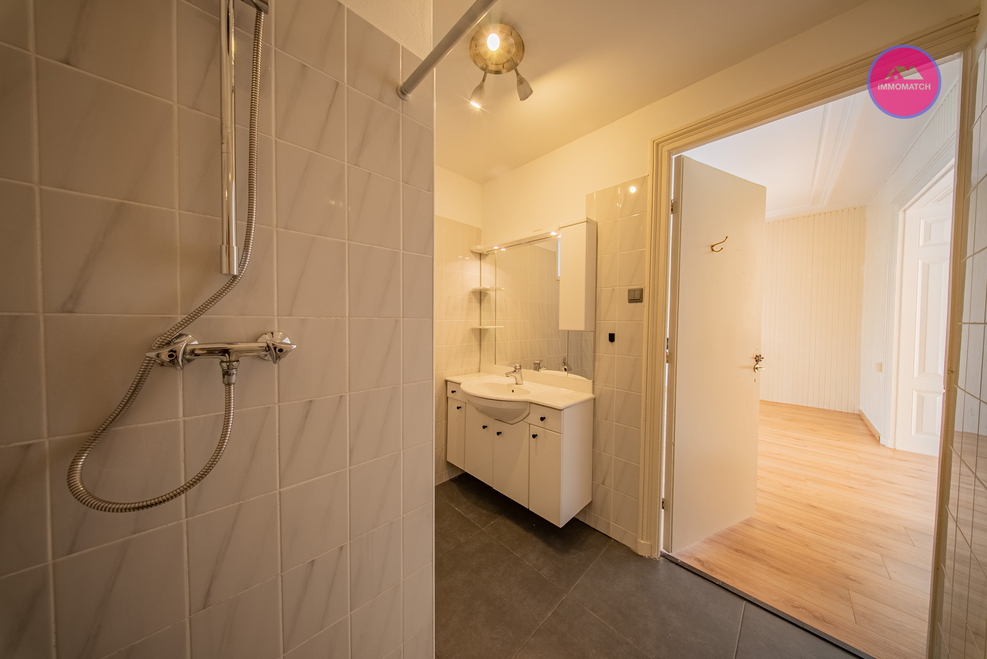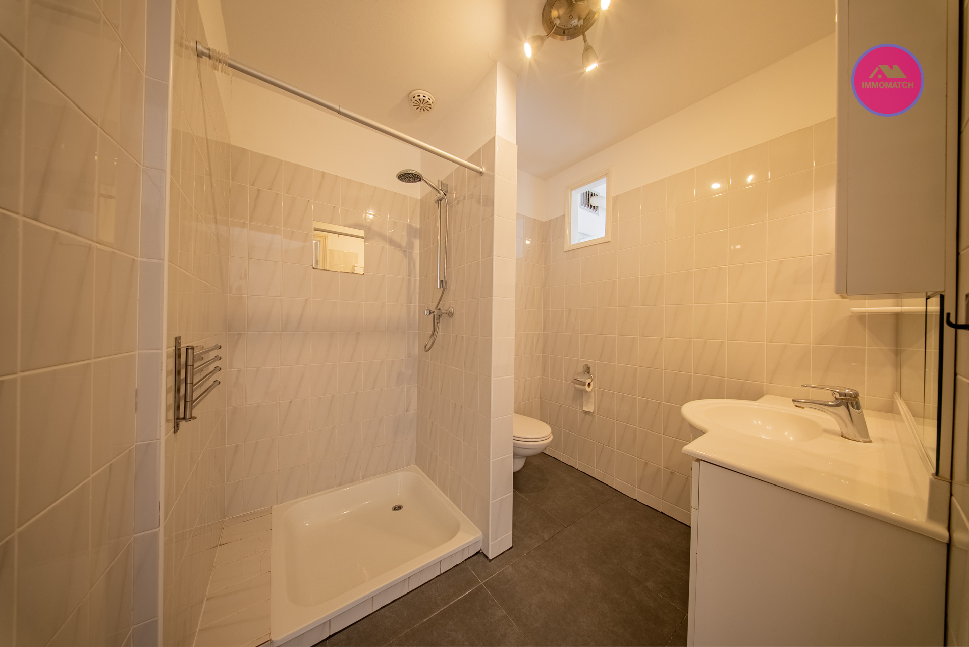 De ruime badkamer is uitgerust met een douche, toilet en wastafel.