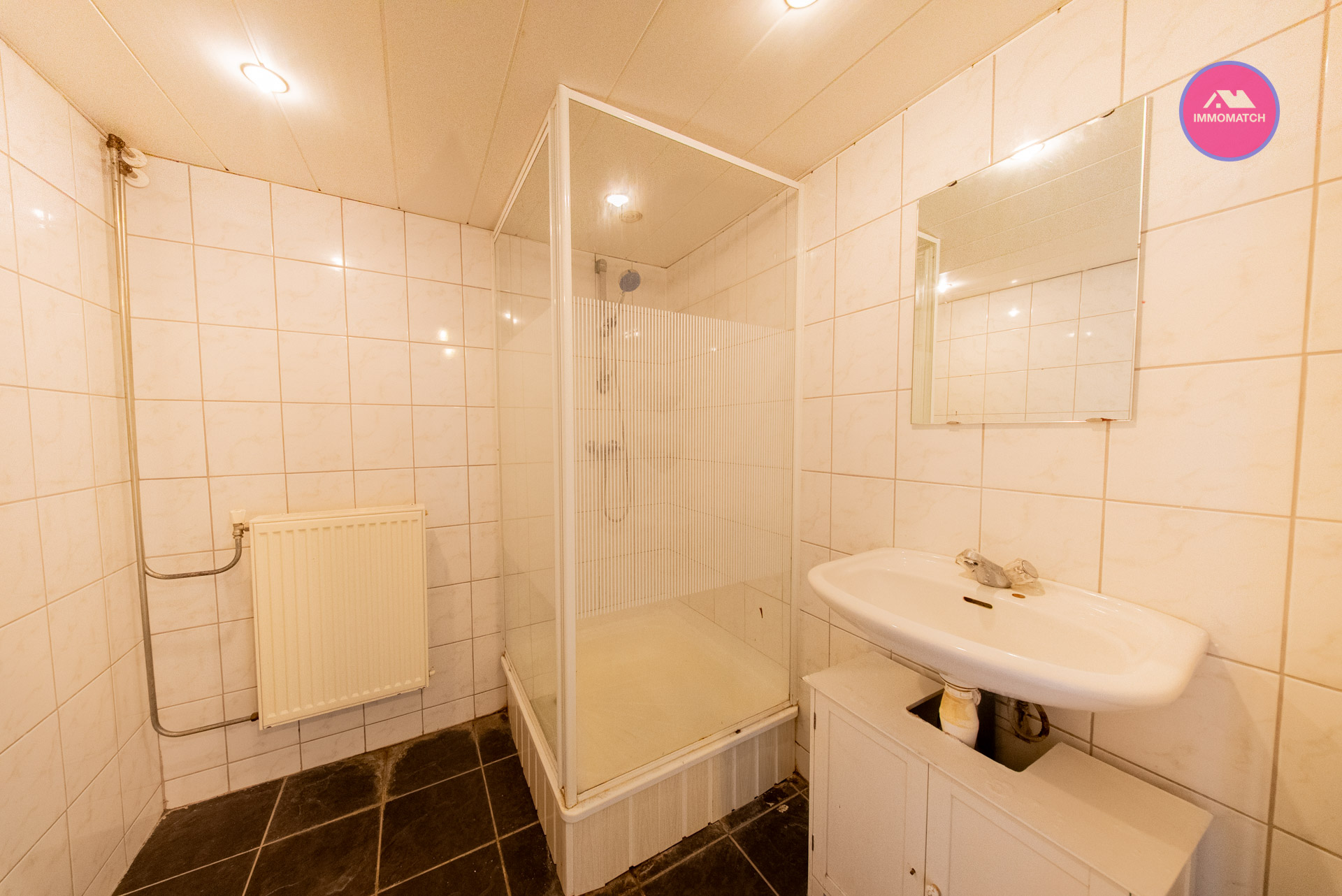 Badkamer met douche en wastafel,
