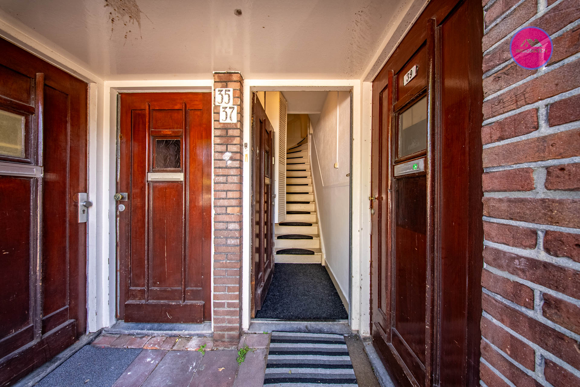 Open portiek, entree met hal en meterkast, trap naar eerste verdieping,