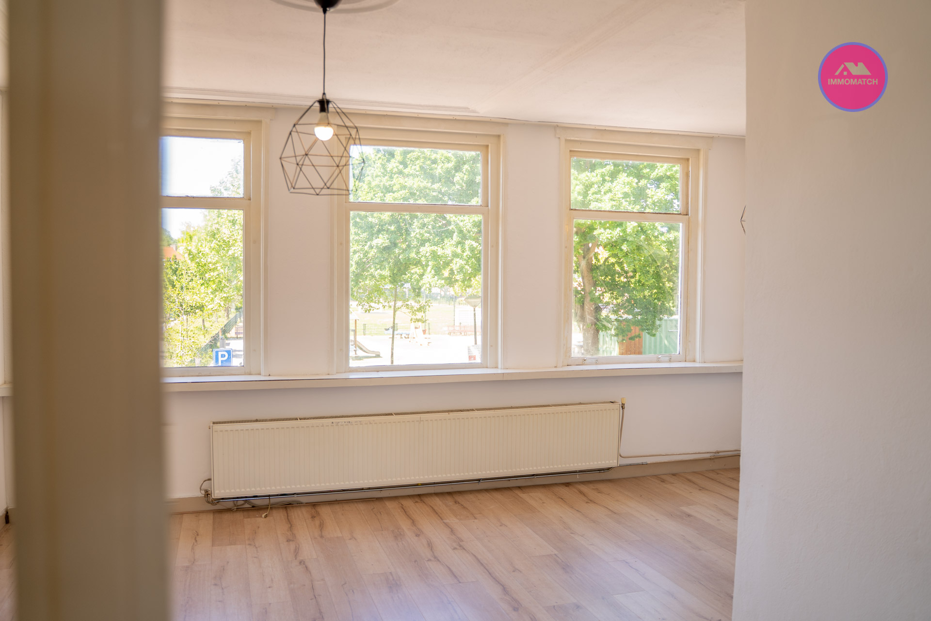 Aan de voorzijde ruime woon-/eetkamer met veel lichtinval en vrij uitzicht over de speeltuin.