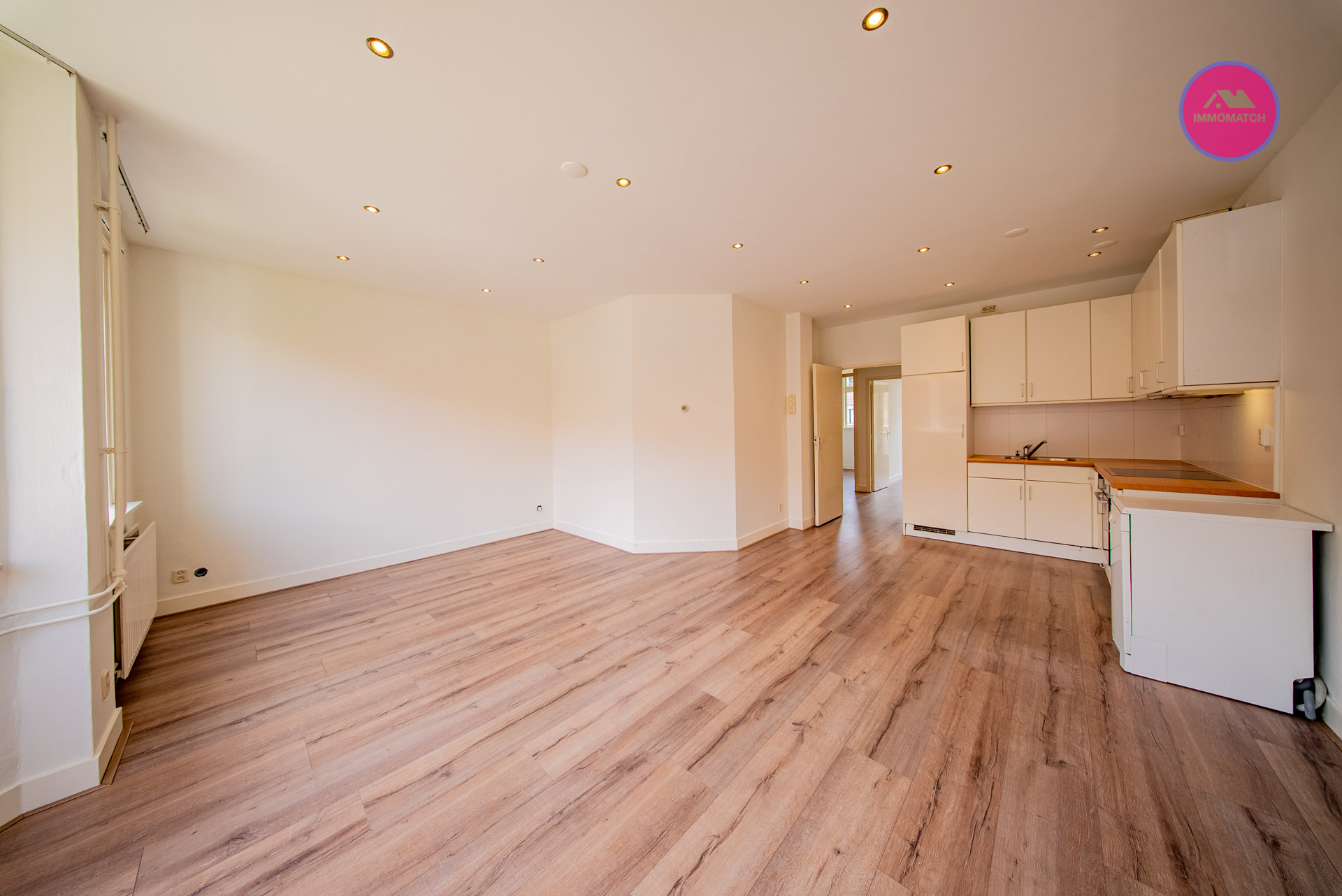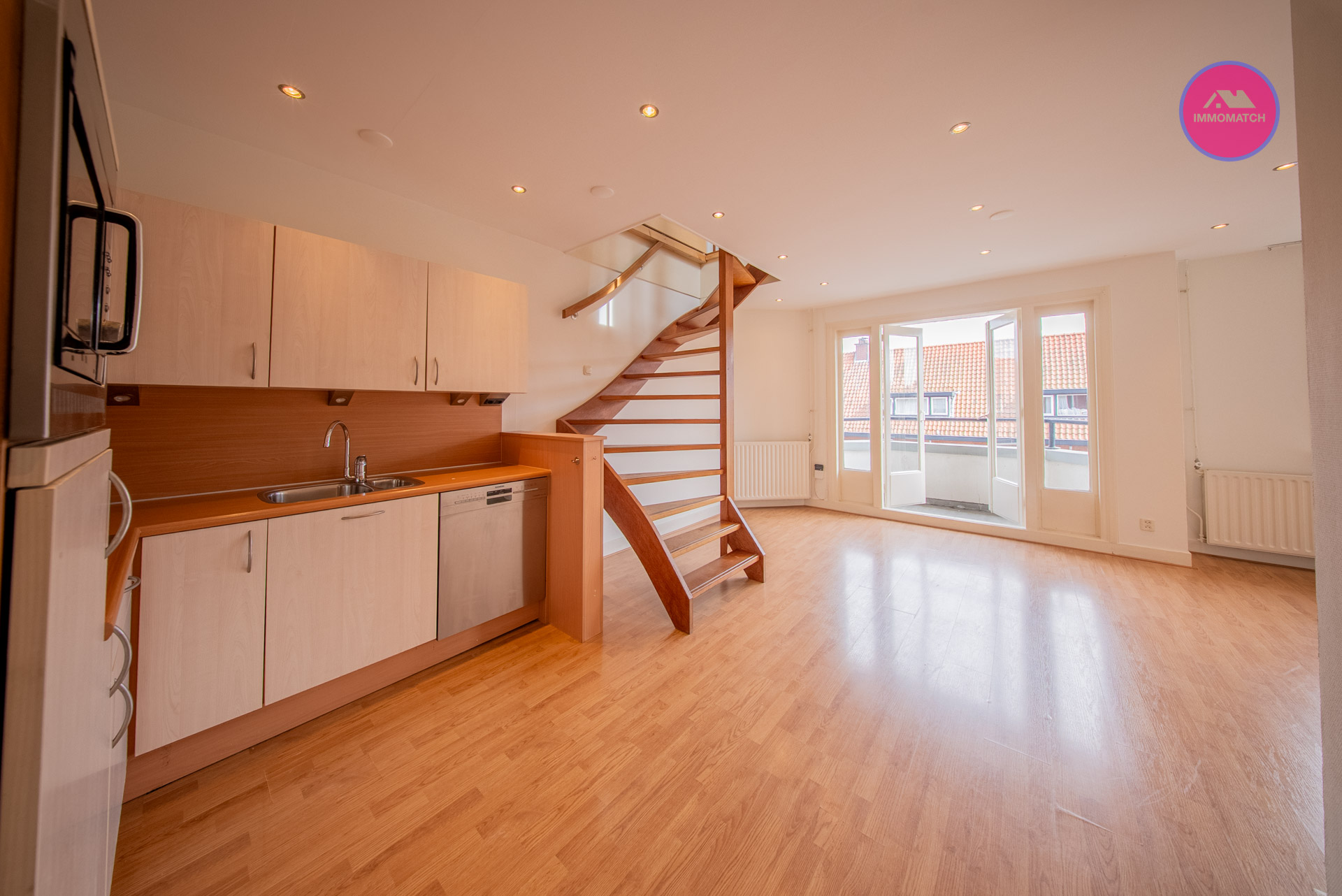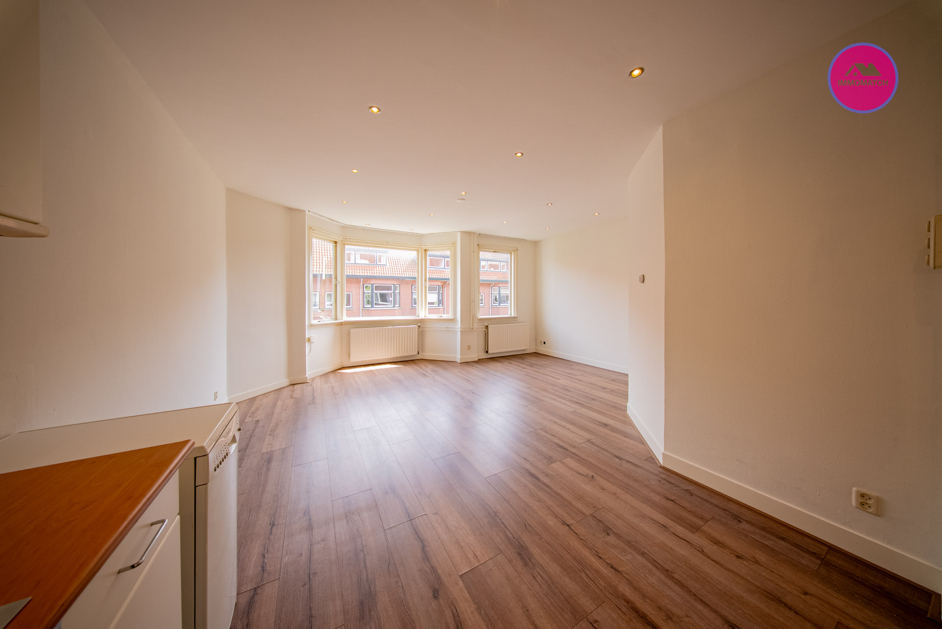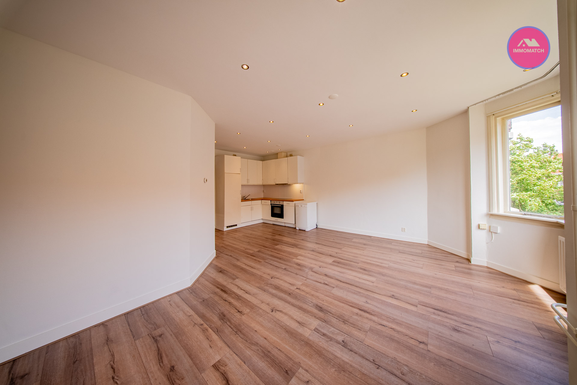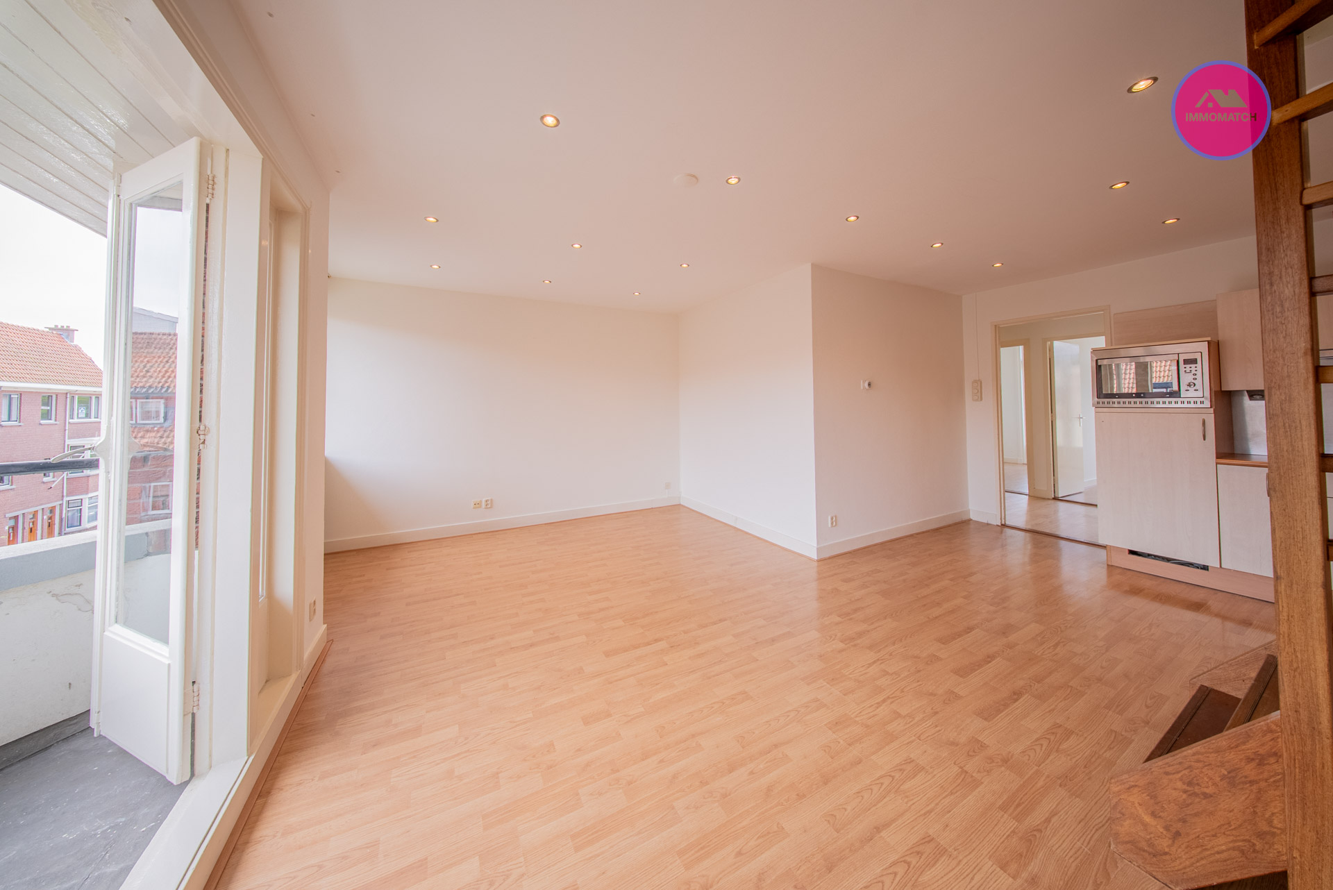 Ruime en lichte woonkamer met open keuken en toegang tot het derde balkon aan de voorzijde.